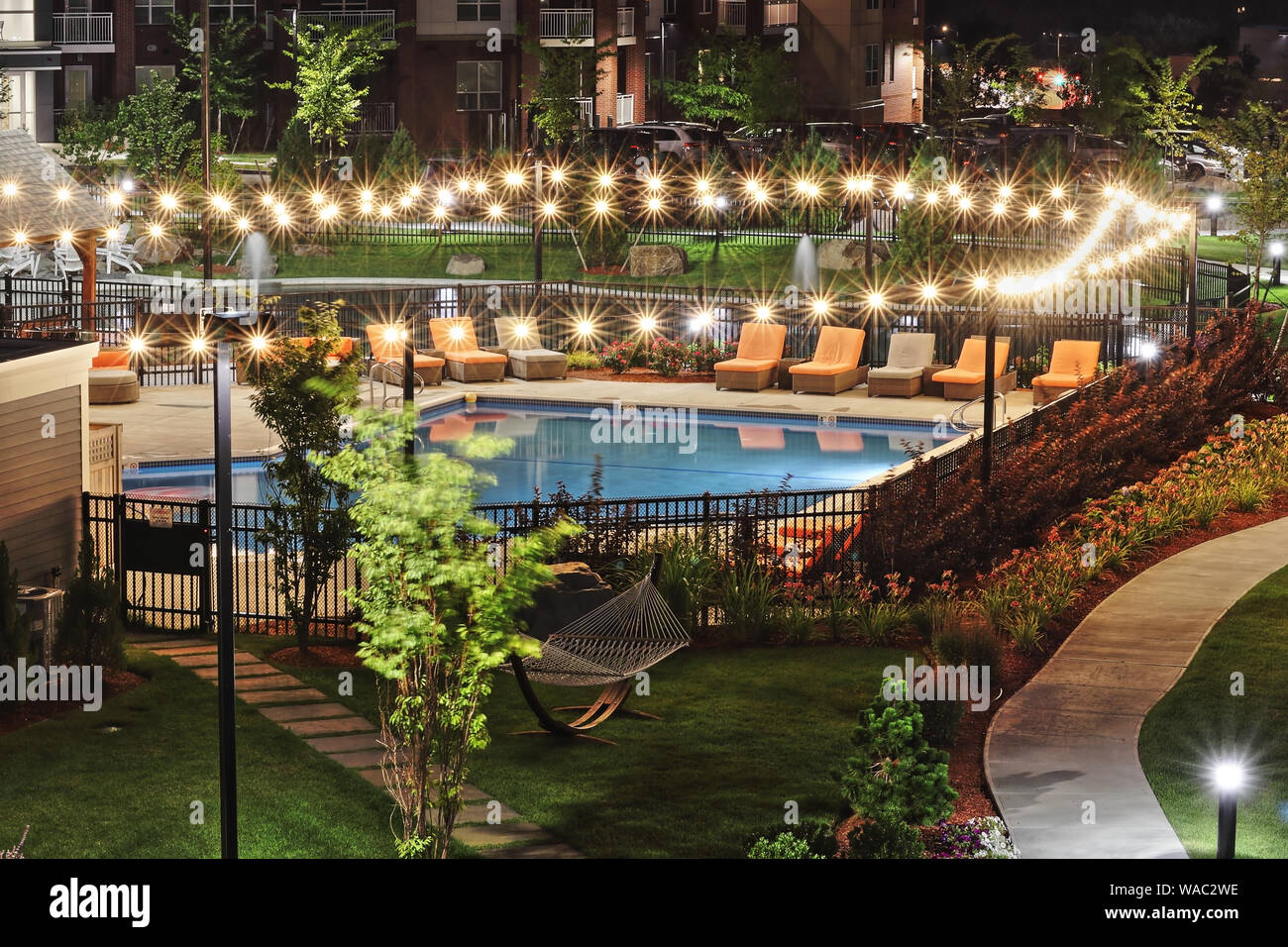 Illuminated Open Swimming Pool In An Apartment Complex At Night